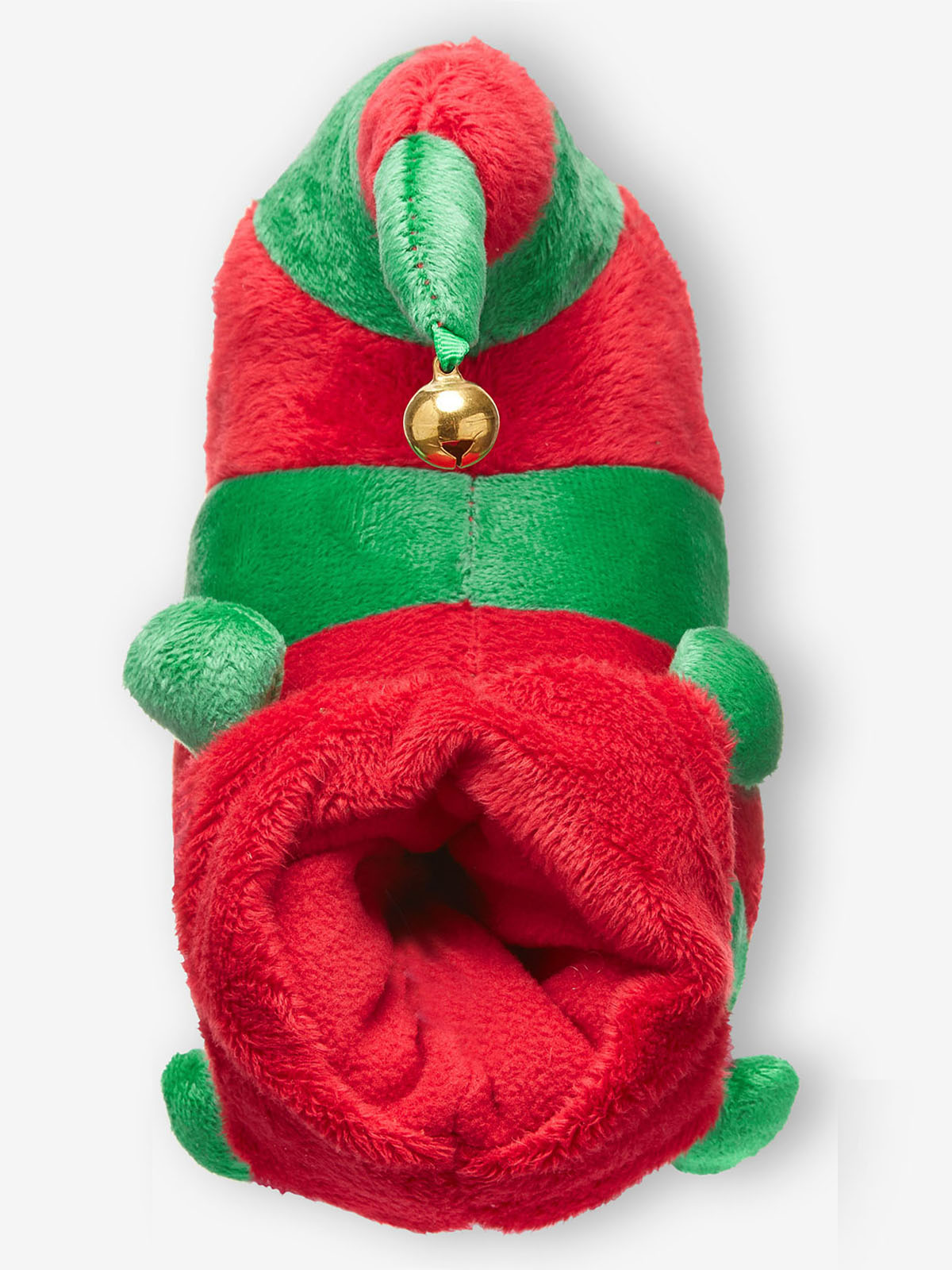 Unisex novelty Christmas elf slippers. Green and red with bell on toe and pom pom trim.