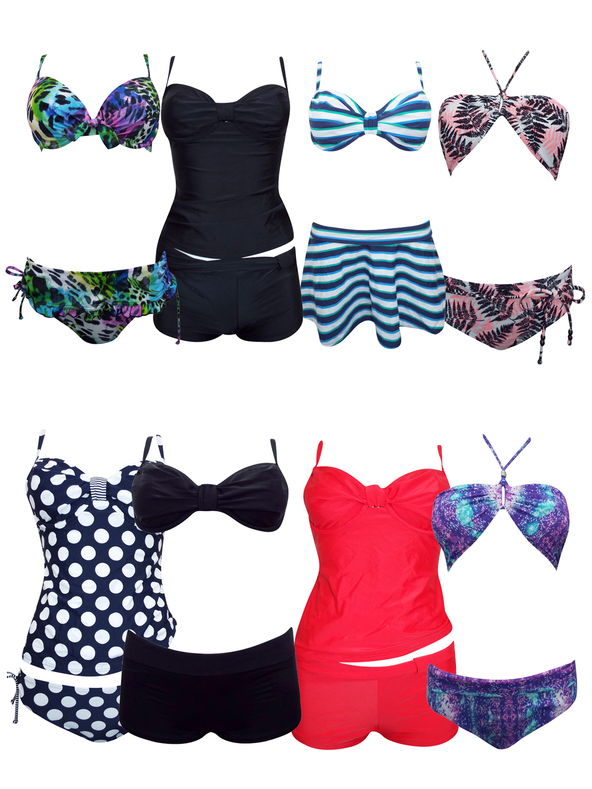 A mixed pack of tankinis and bikini pieces with a variety of styles and colors.
