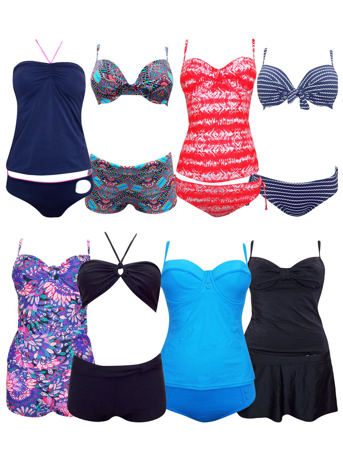 A mixed pack of tankinis and bikini pieces with a variety of styles and colors.