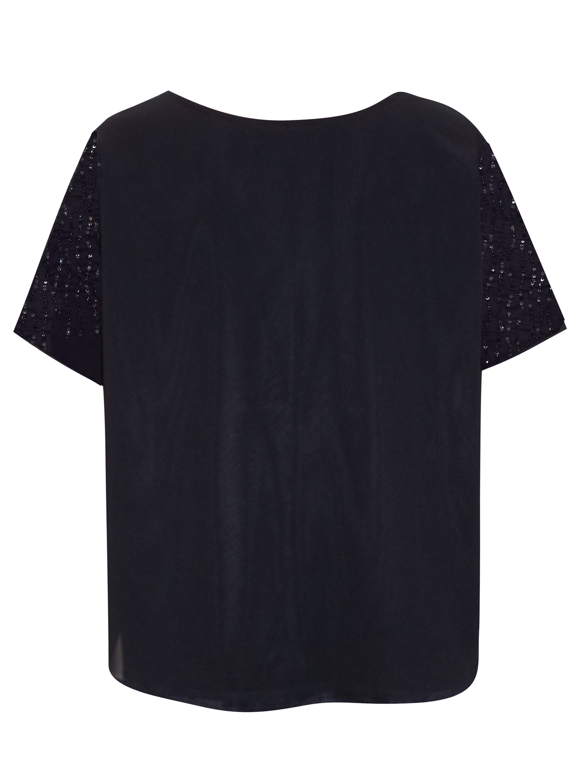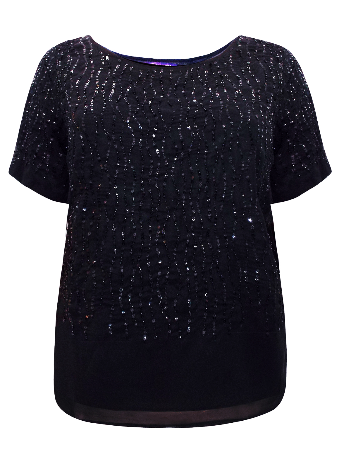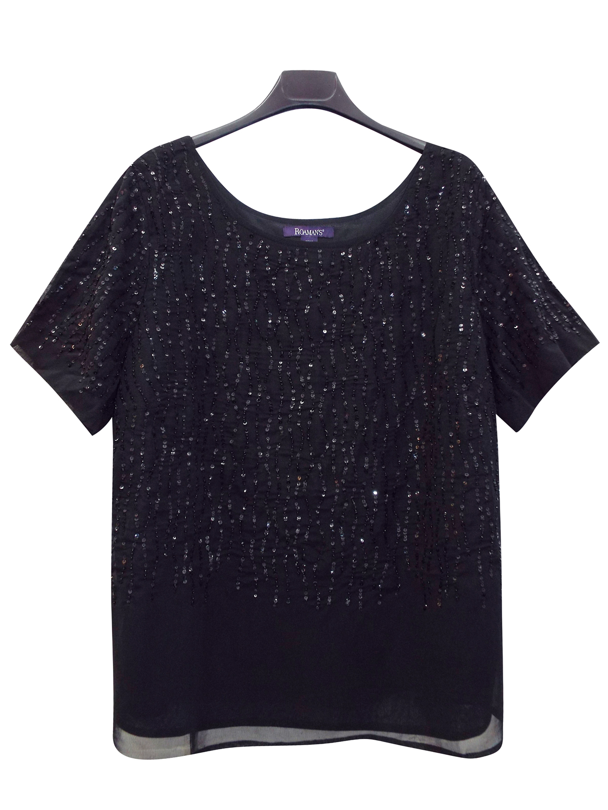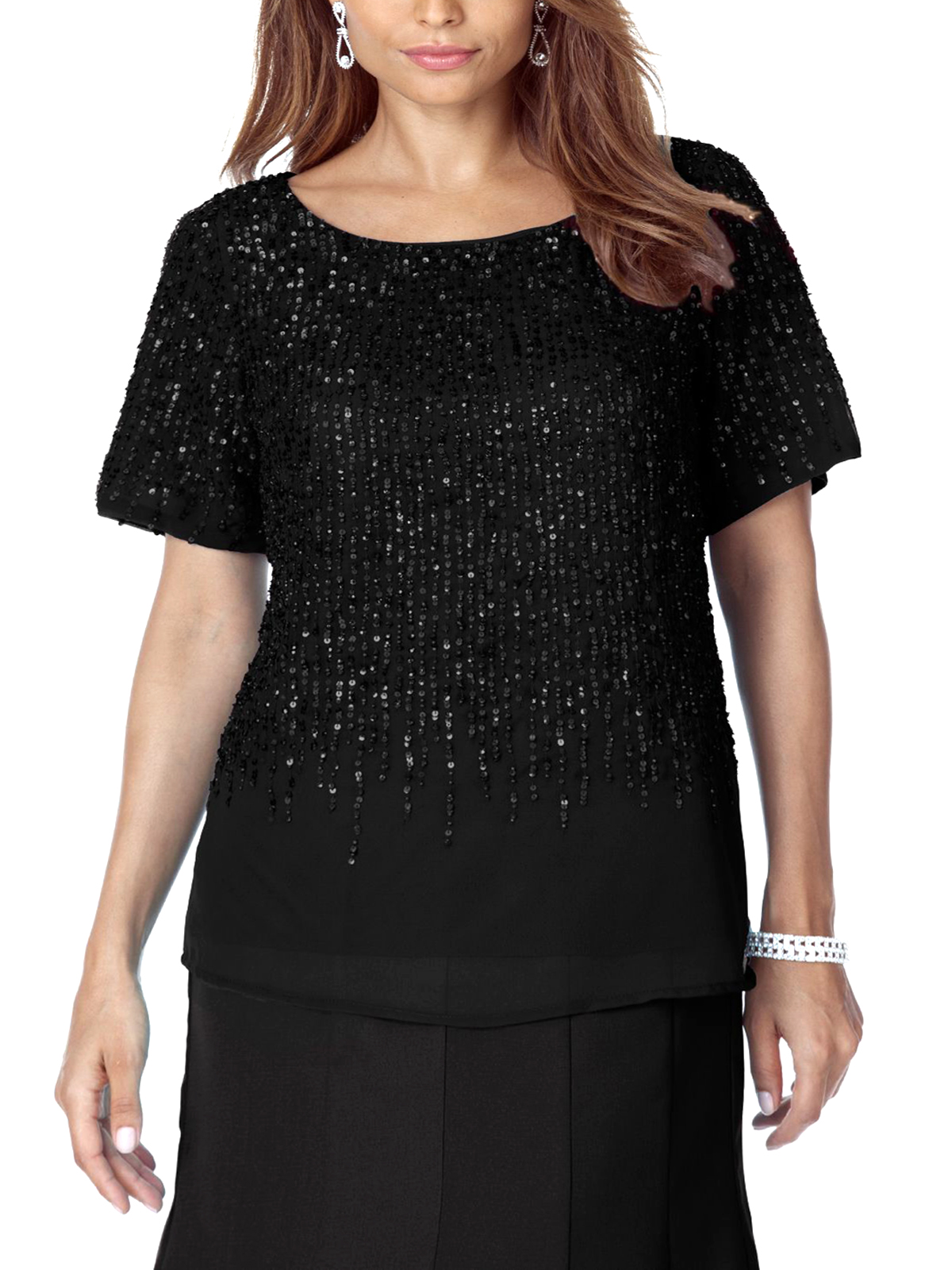 This pretty top with a scattered embellished design is perfect for an occasion. Featuring a scoop neck, short sleeves and scattered sequins. Lined. Length 28in.