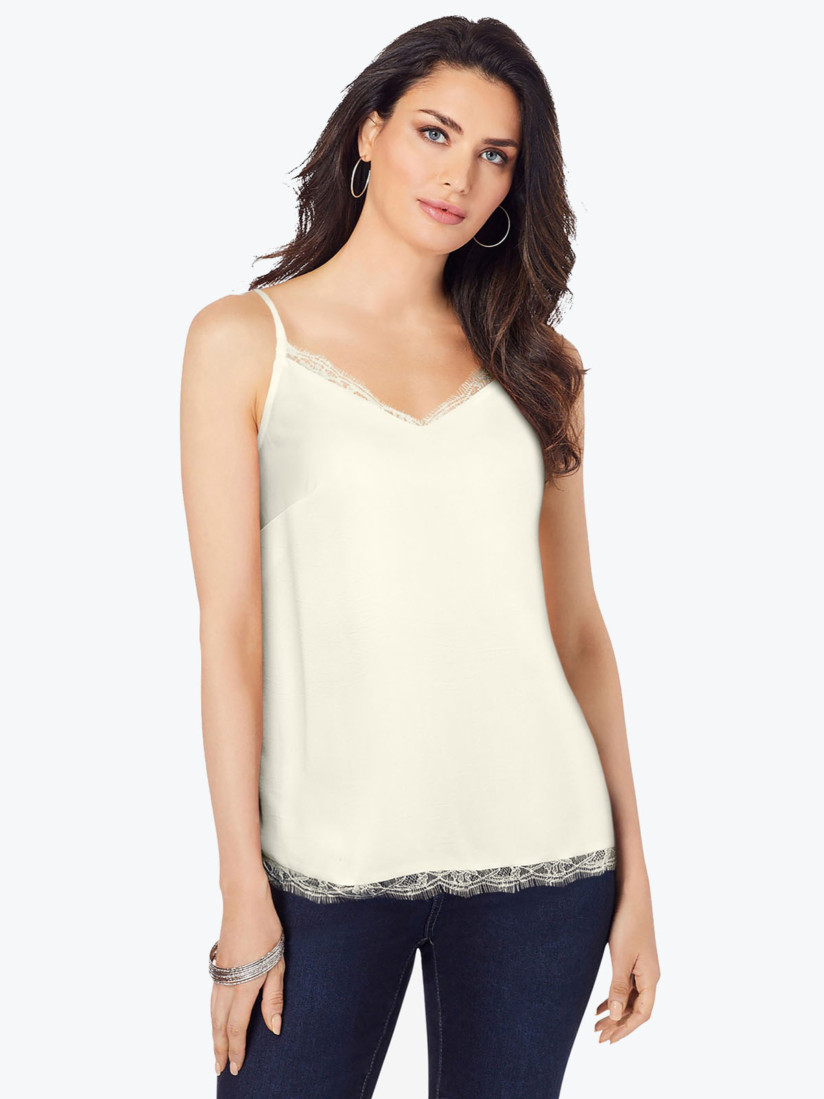 This pretty sleeveless tank is a key layering piece for any wardrobe. Adjustable straps. Lace trim at hem. Poly hammered satin. Length 23in.