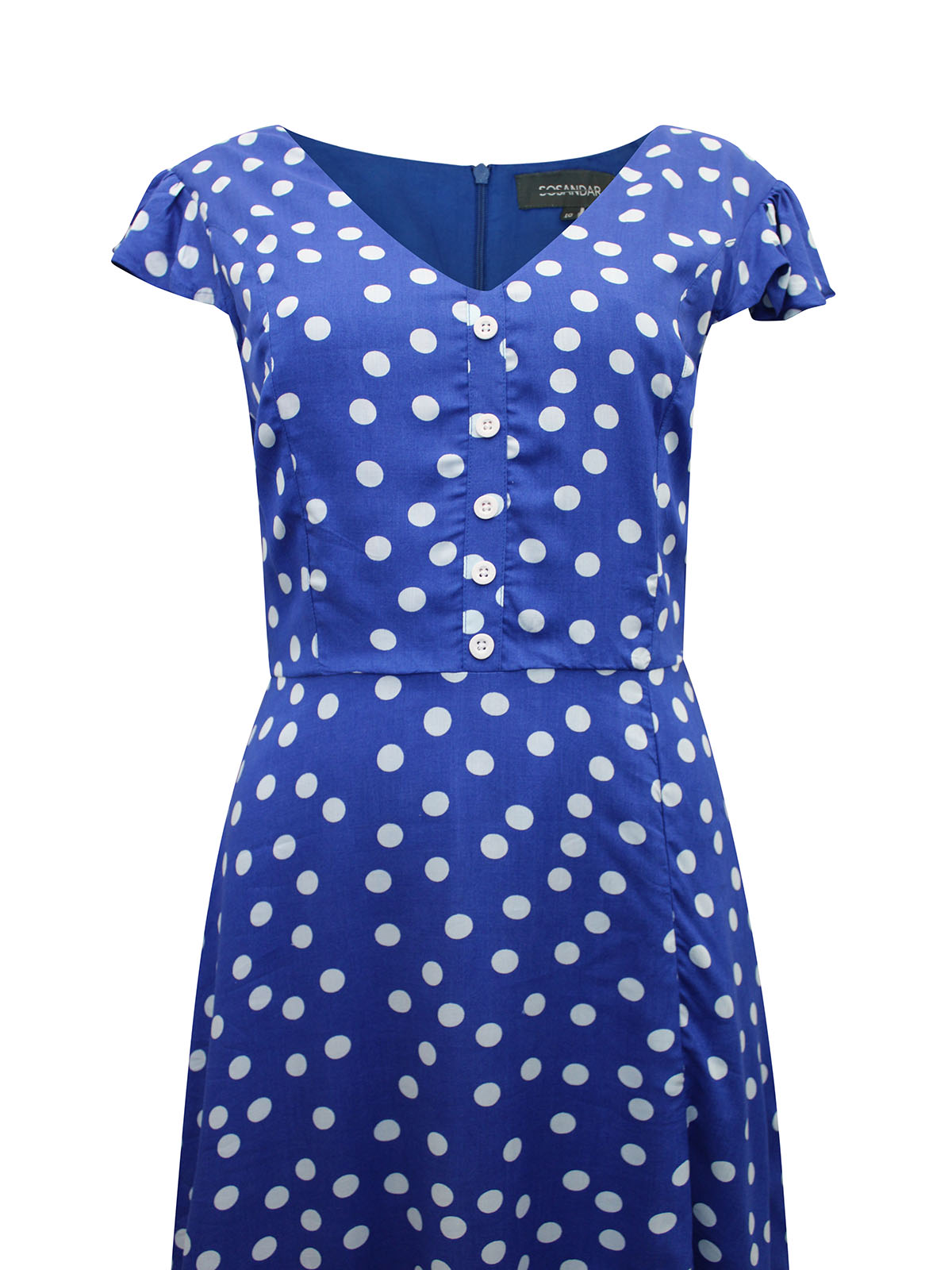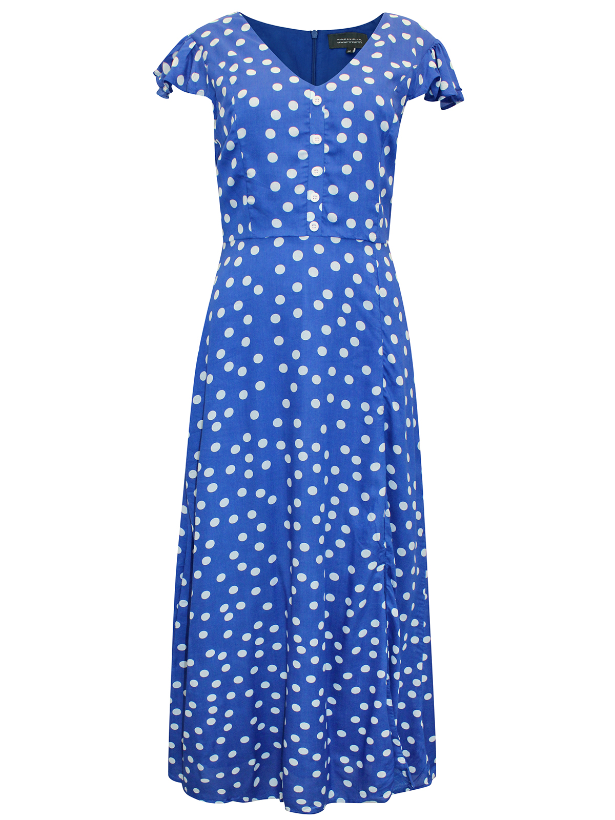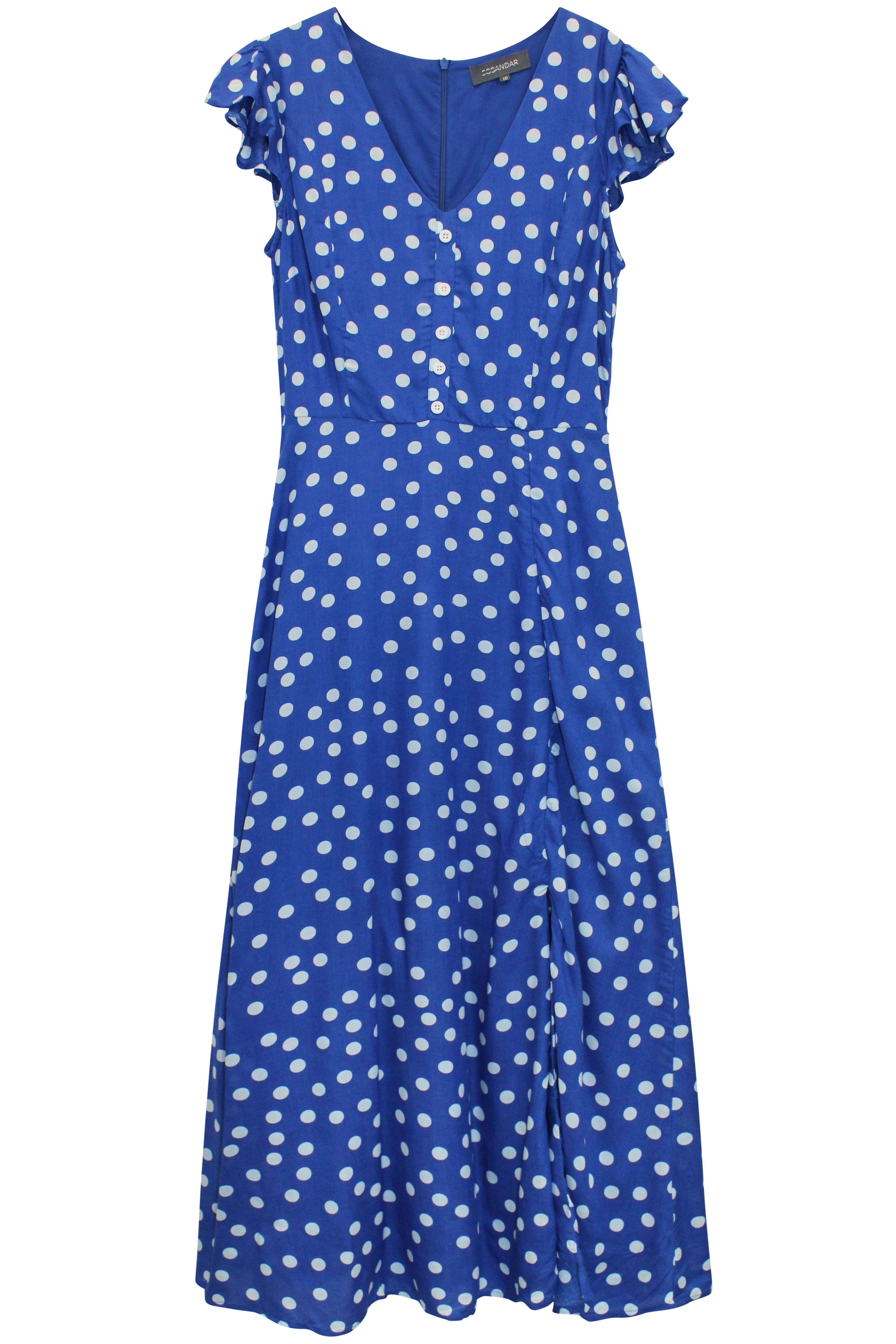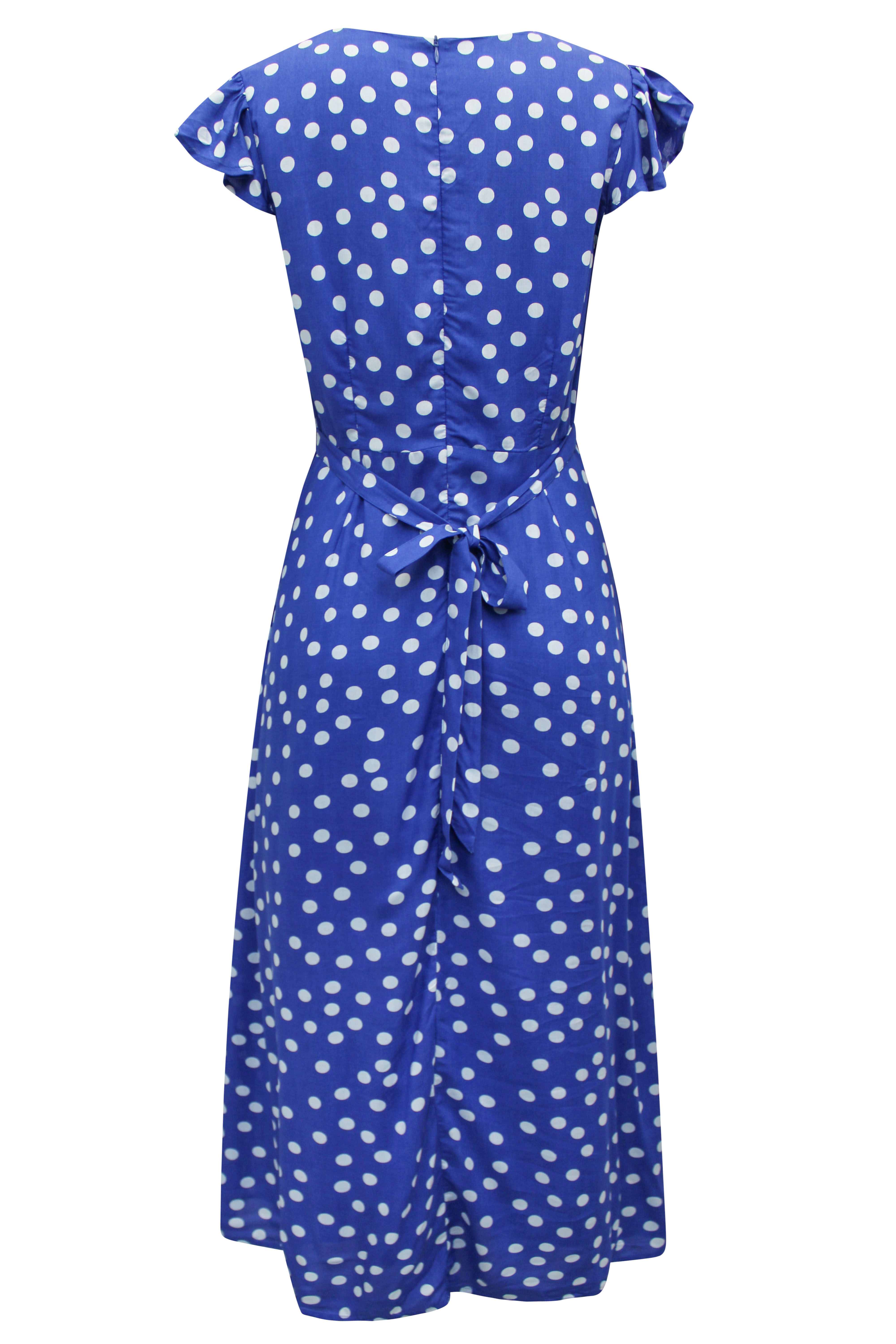 Covered in a sweet spot print this cool and breathable dress is ideal for the Summer months ahead. Featuring a v-neckline with button front, functional back zip and delicate frill sleeves. Ties at the back. Length 52in.