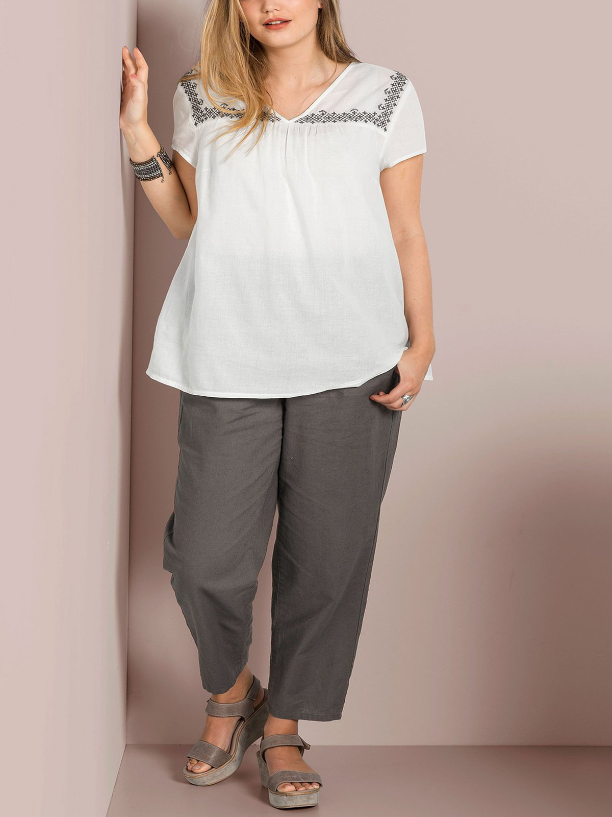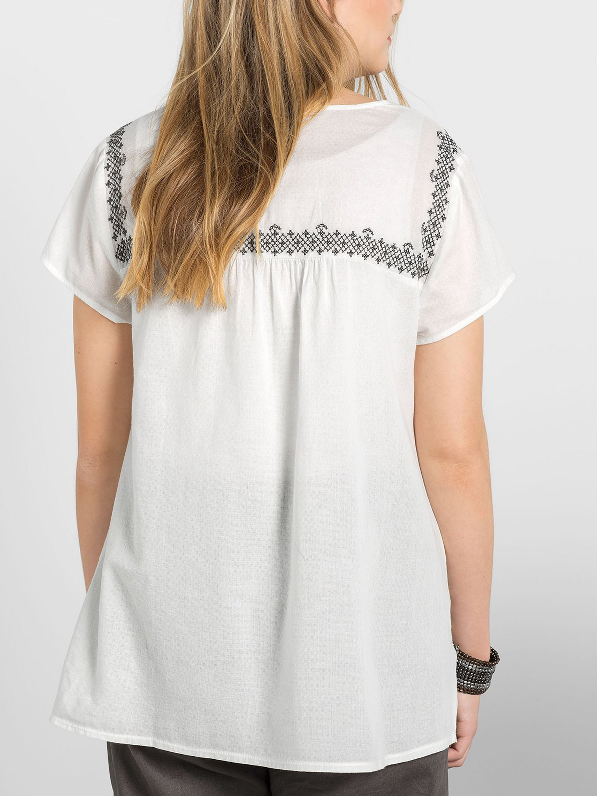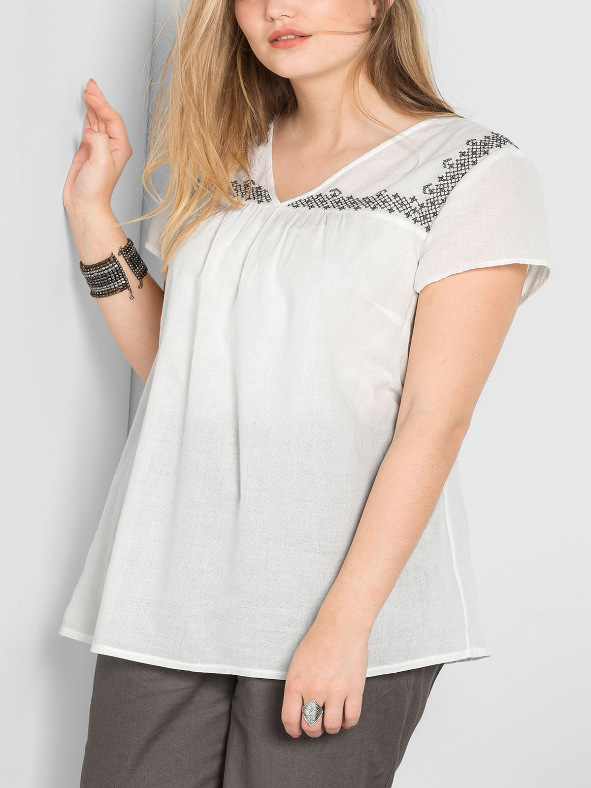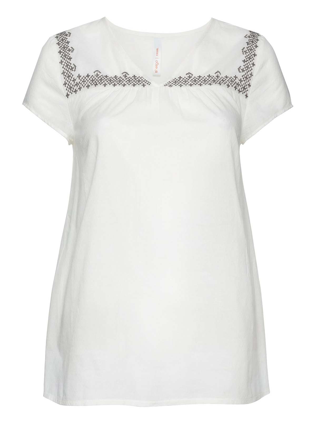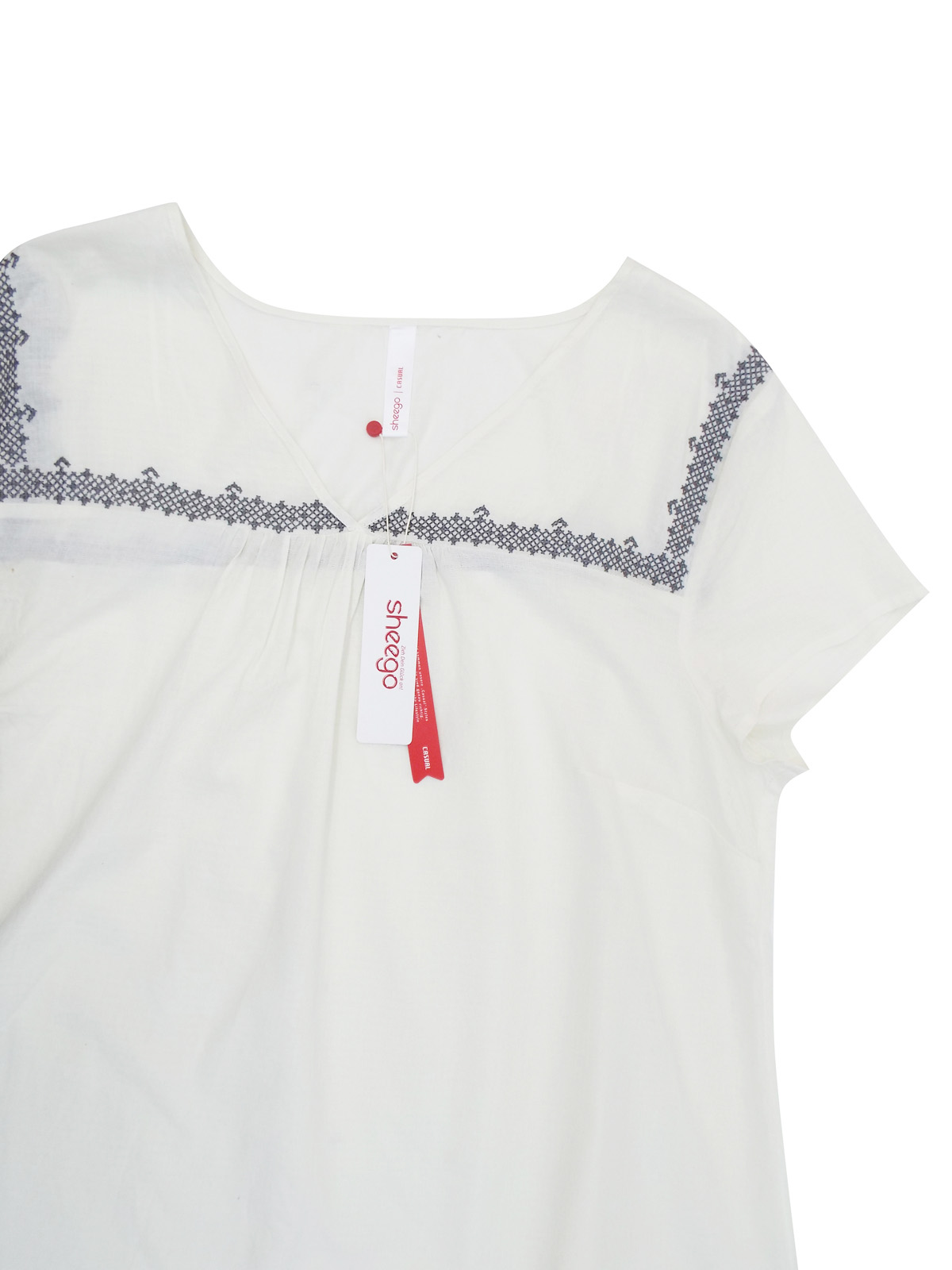 This cream embroidered smock top is the perfect top to wear in the warmer months. Featuring a v-neck, short sleeves and embroidered detail. Length 33in.