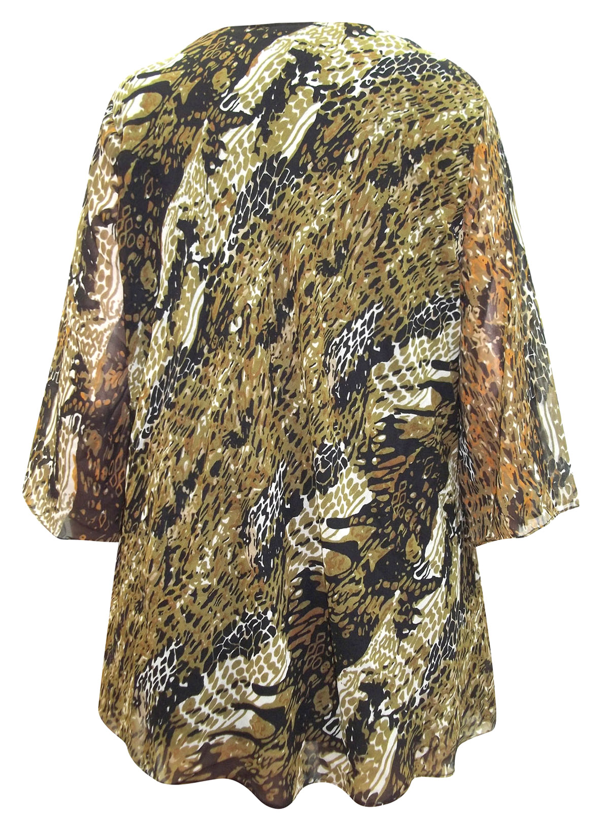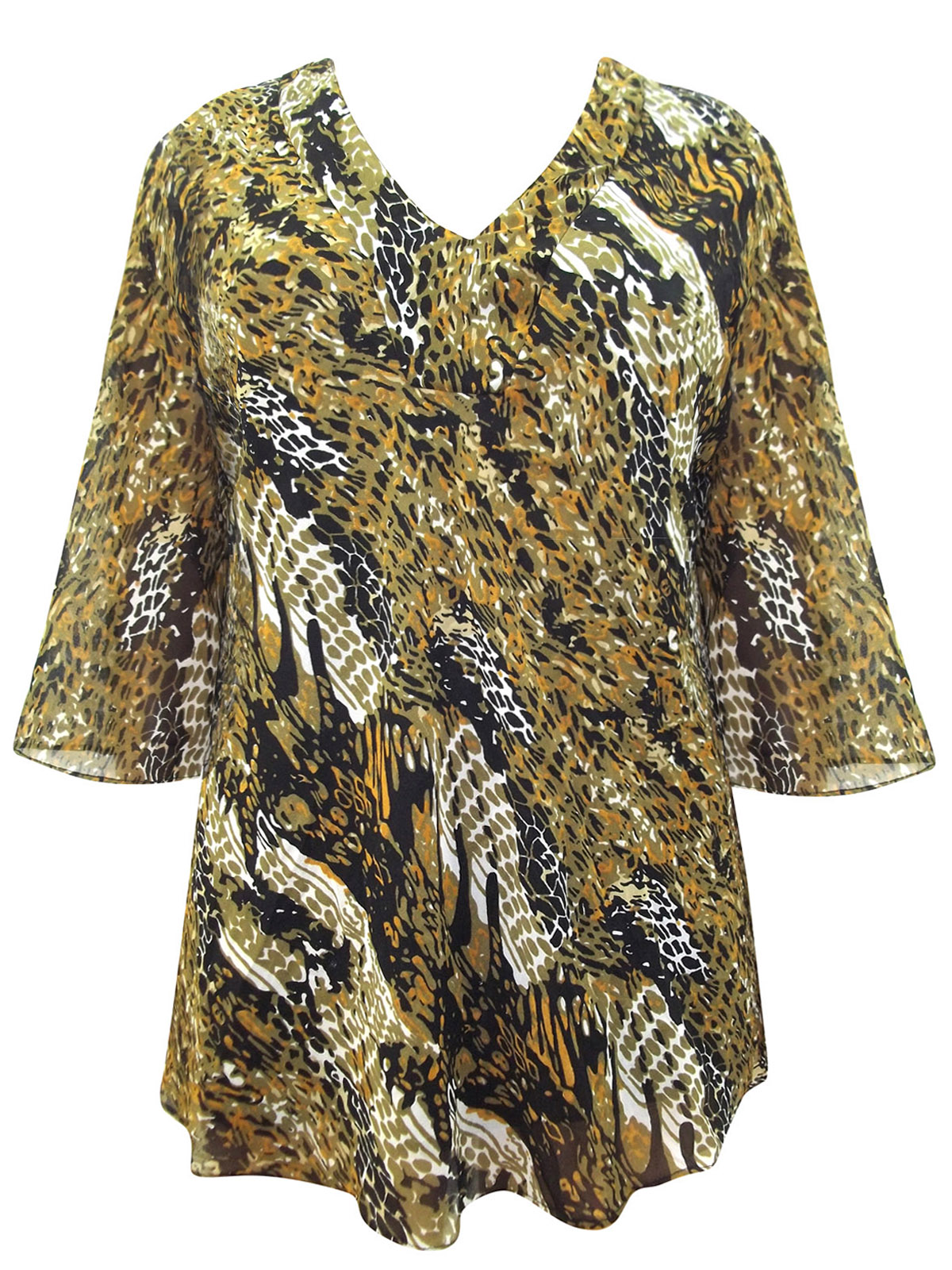 Plus size v-neck chiffon tunic in animal print and three quarter semi-sheer sleeves. Sits lower hip. Lined.