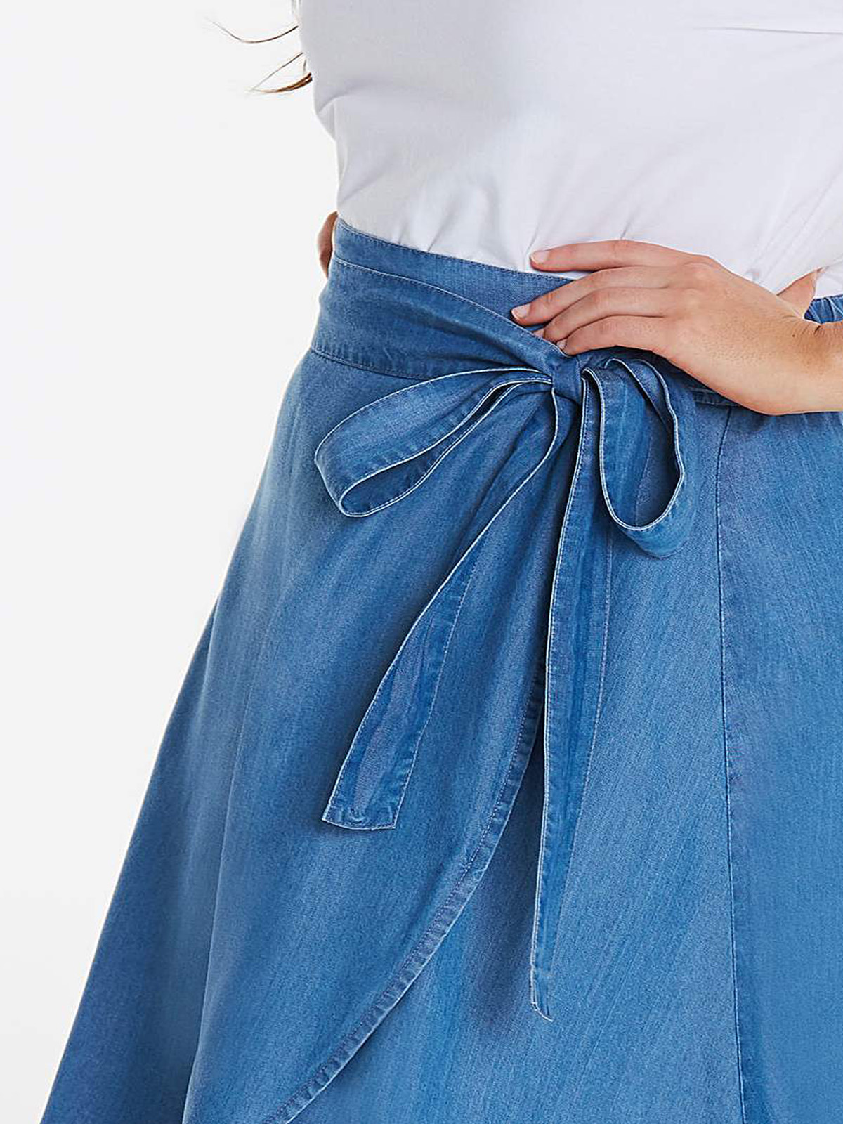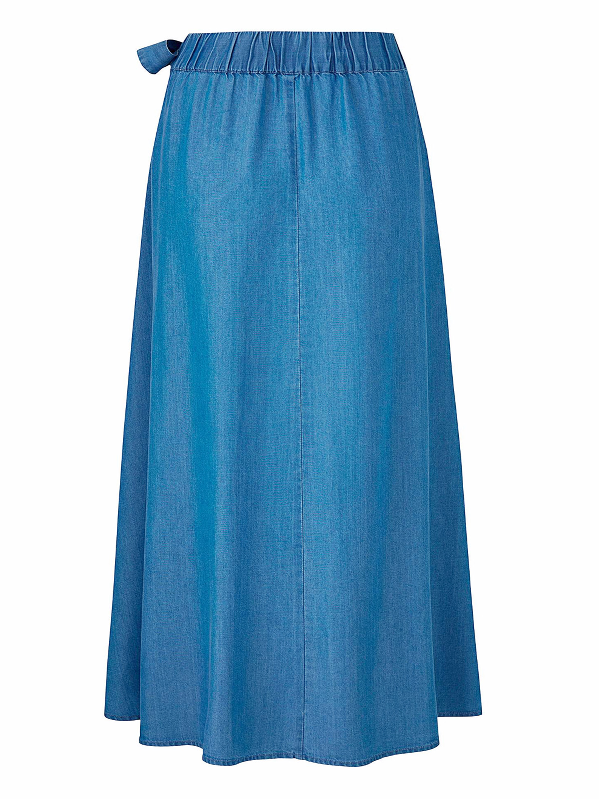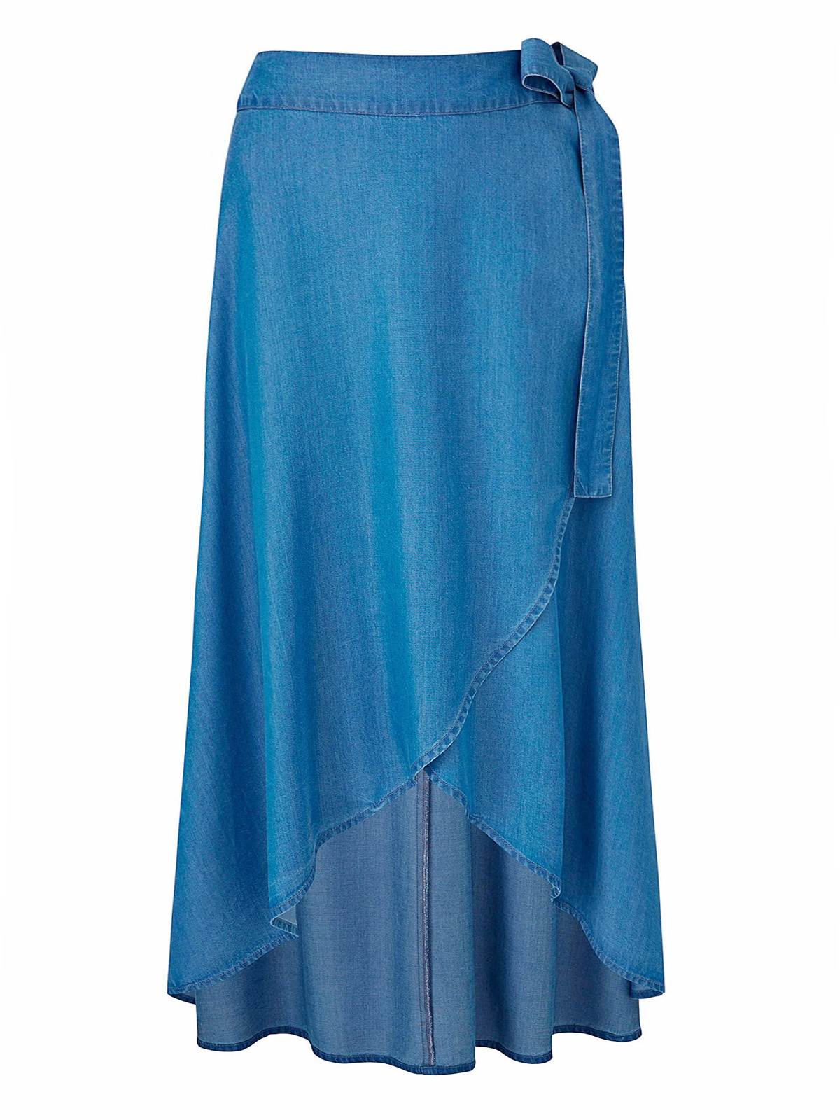 This wrap skirt is a great addition to your wardrobe this season. In a soft lyocell denim fabric, this skirt has a wrap feature which makes the style super-flattering. A great easy-to-wear floaty skirt for your holidays. Length at front - 25in/63.5cm. Length at back - 36in/91.5cm.