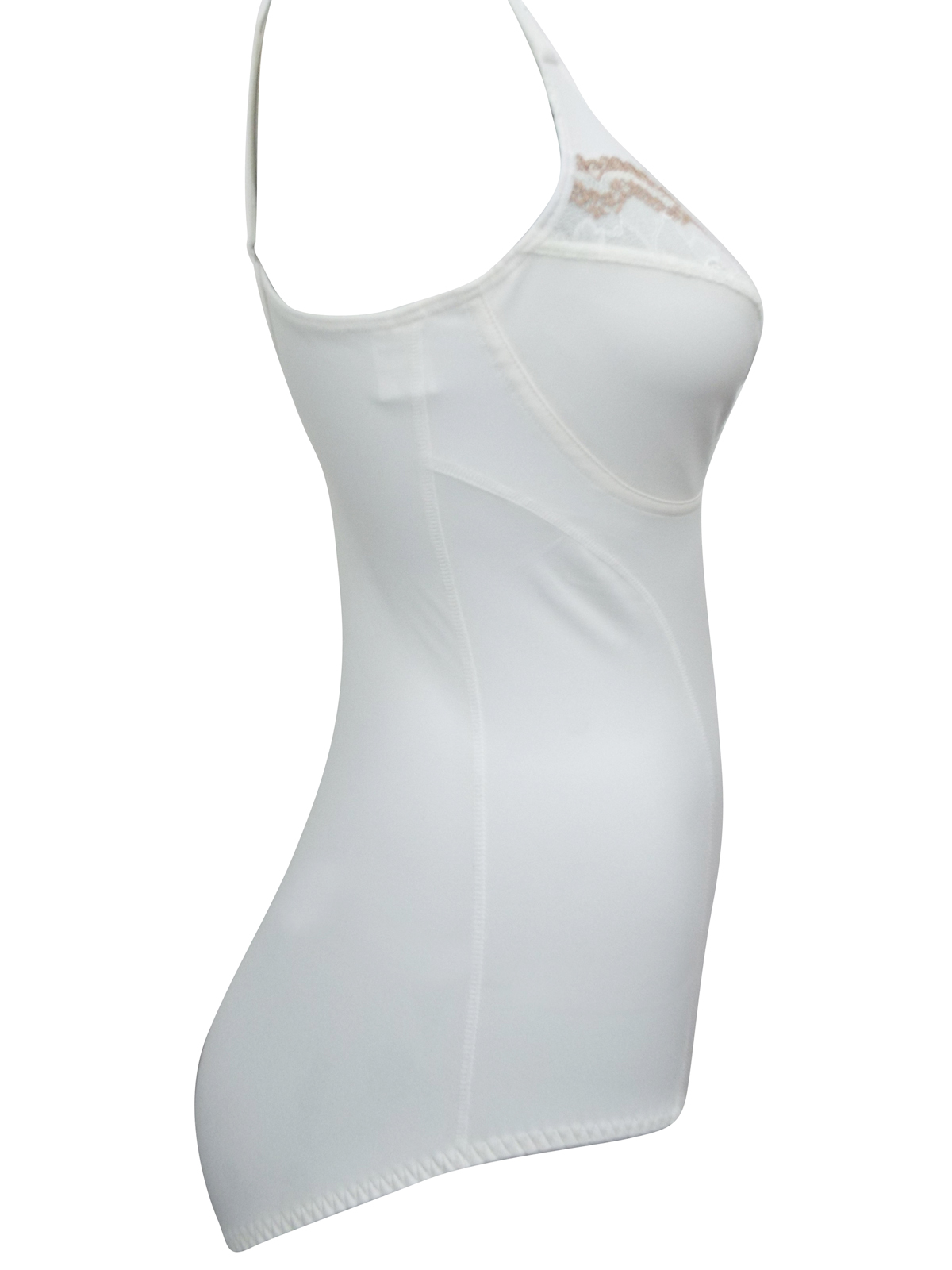 Gorgeous silky fabric with additional lace trim, the body shaper gives an attractive silhouette under clothes with a medium control smooth tummy panel. Padded and adjustable shoulder straps for better support.