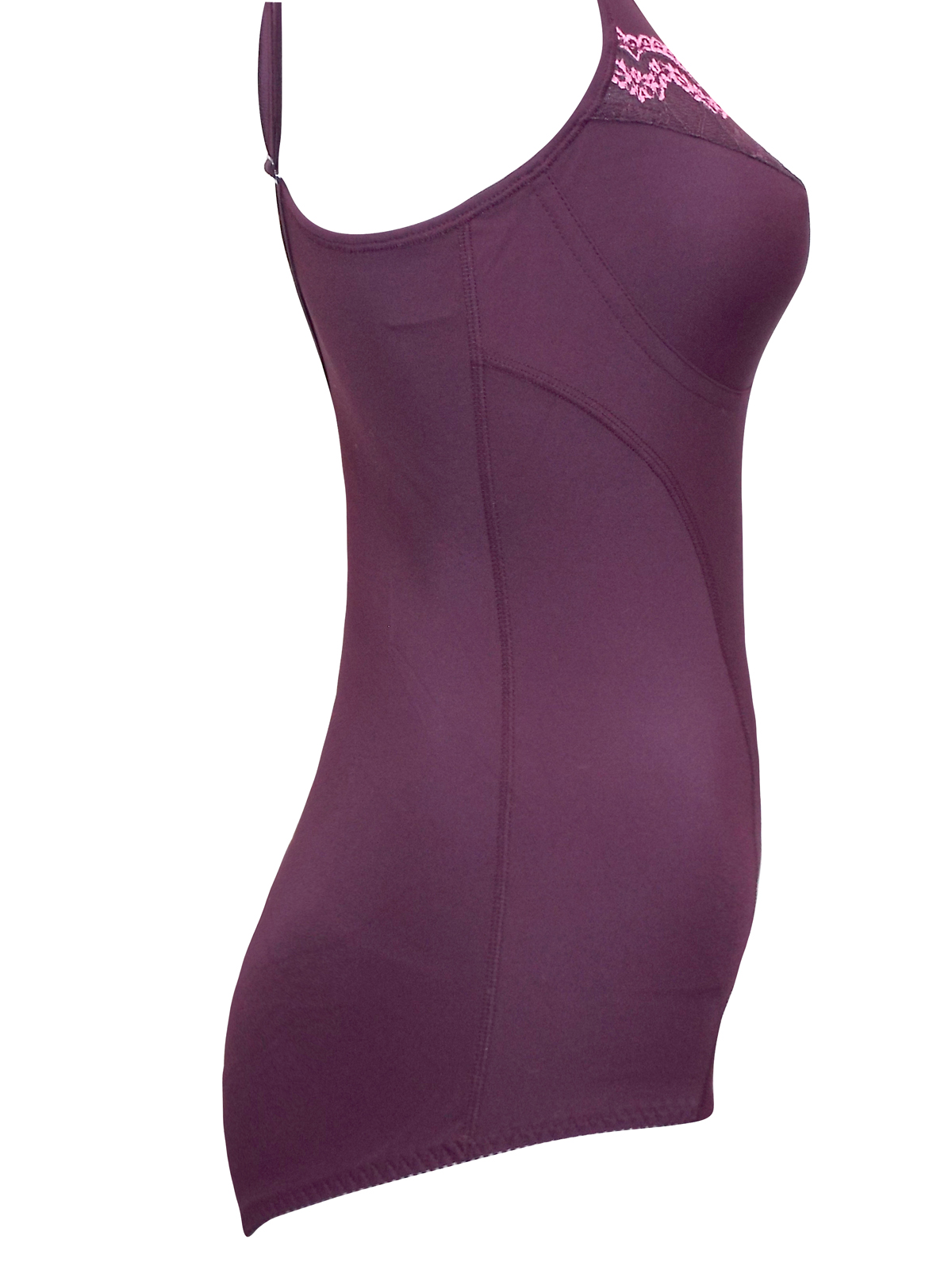 Gorgeous silky fabric with additional lace trim, the body shaper gives an attractive silhouette under clothes with a medium control smooth tummy panel. Padded and adjustable shoulder straps for better support.