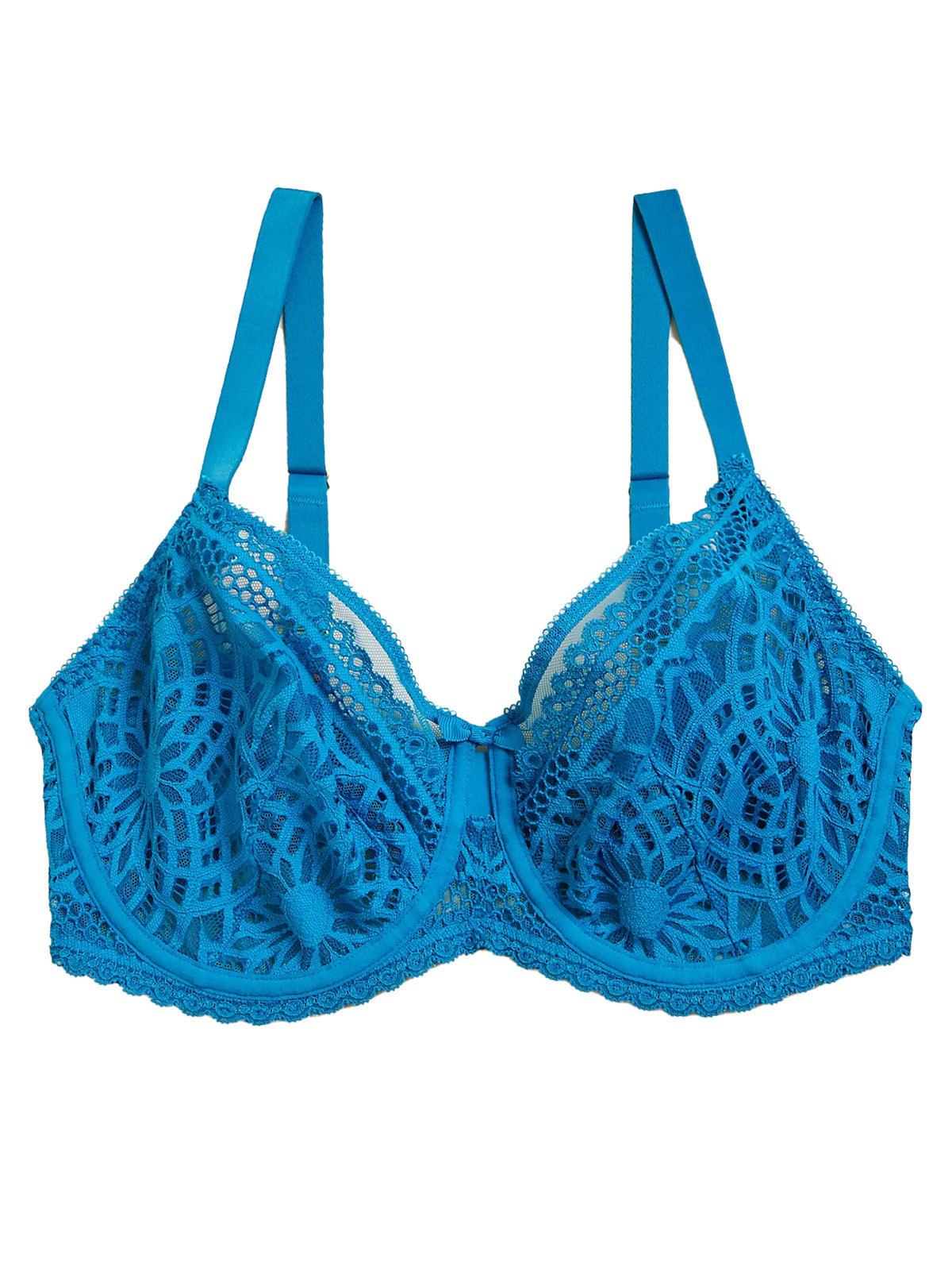 This bra combines feminine geometric lace with delicate mesh inserts. The full cup style is specially designed to support larger busts. It's non-padded and wired for a natural, lifted shape.