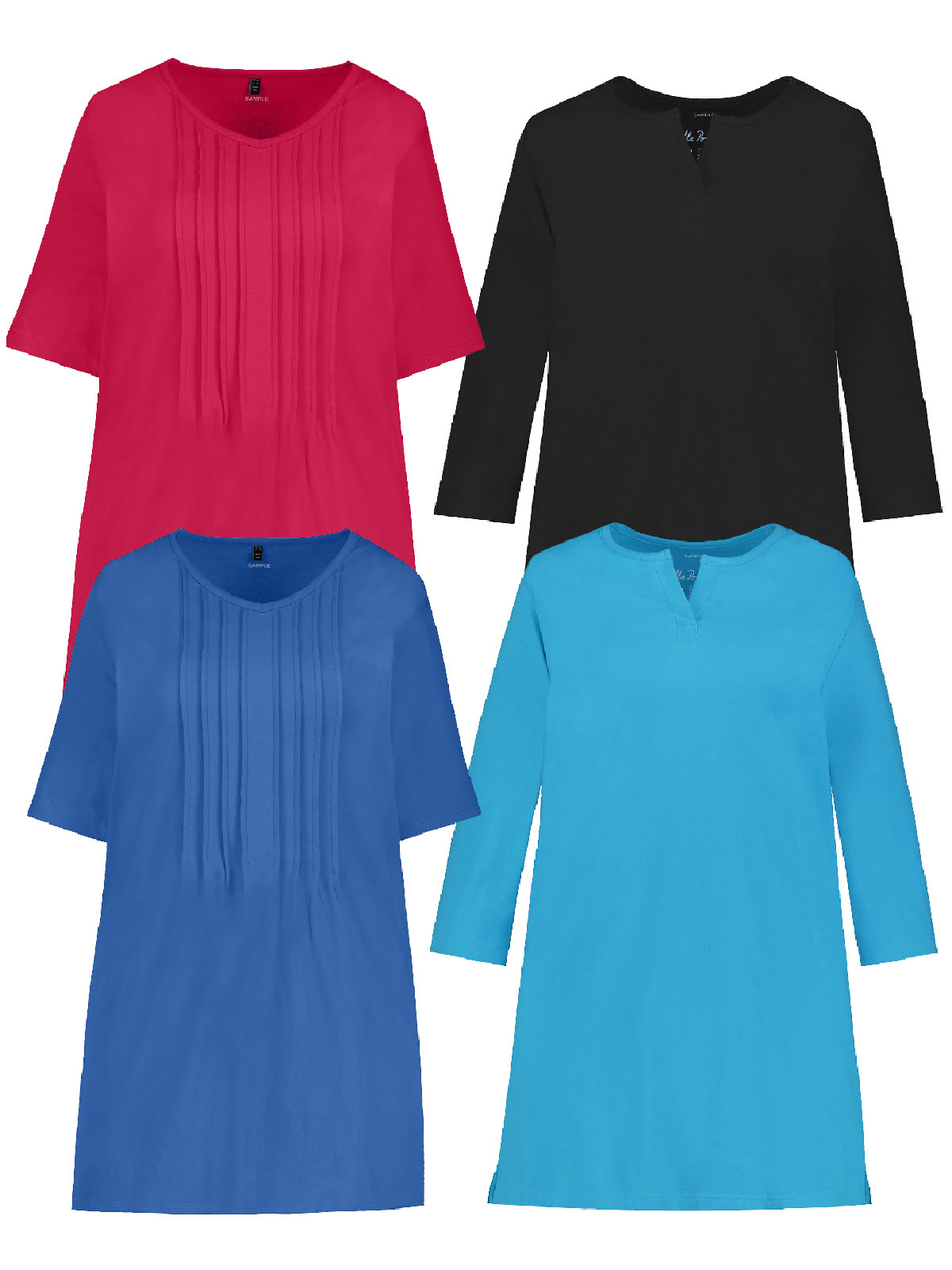 A mixed pack of tunic tops with a variety of styles, colors and lengths.
