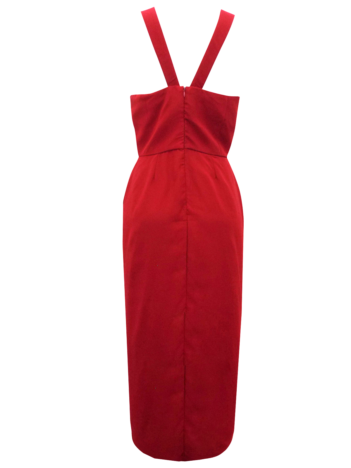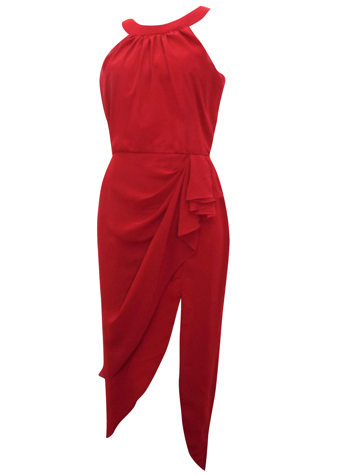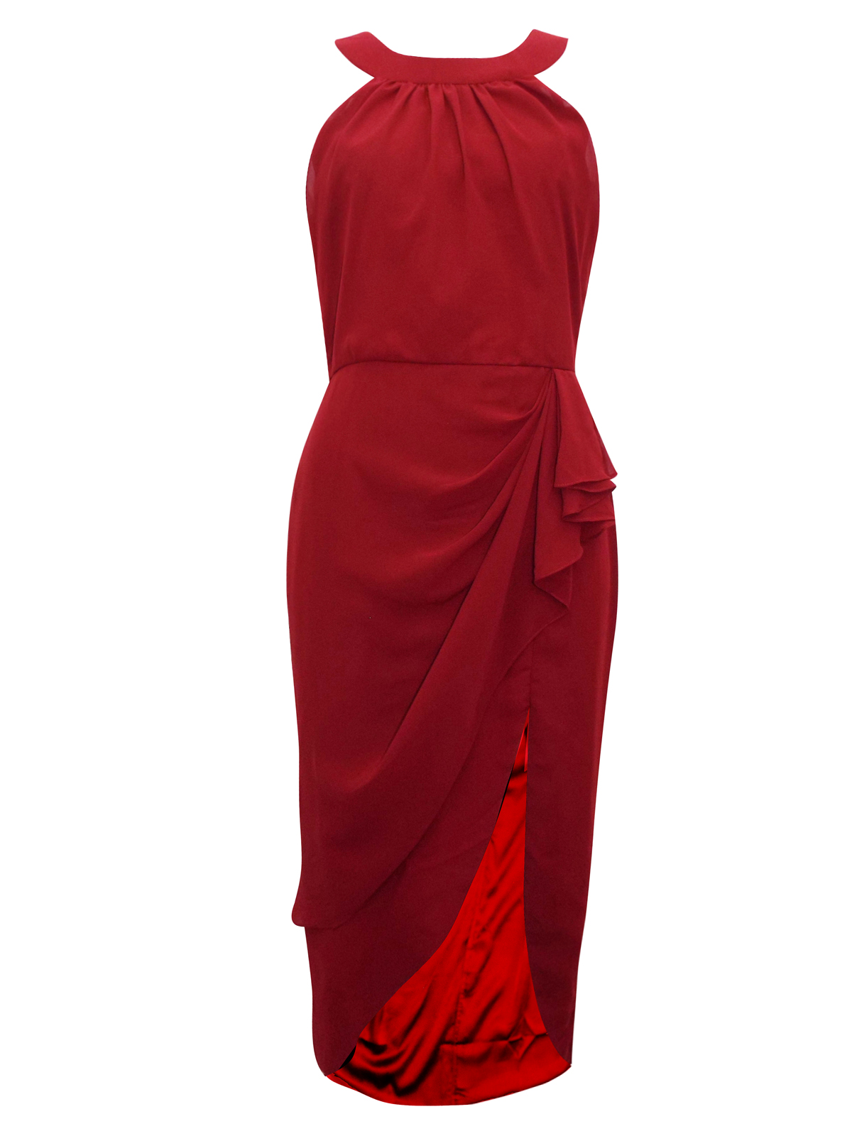 This long elegant dress is crafted from a light chiffon fabric. Featuring a high neckline with gathered detail. Thigh split feature with asymmetric wrap. Concealed back zip fastening. Length 53in