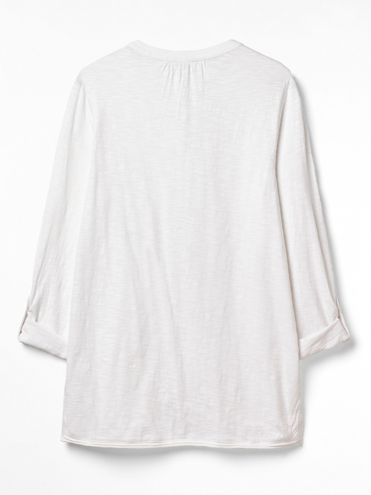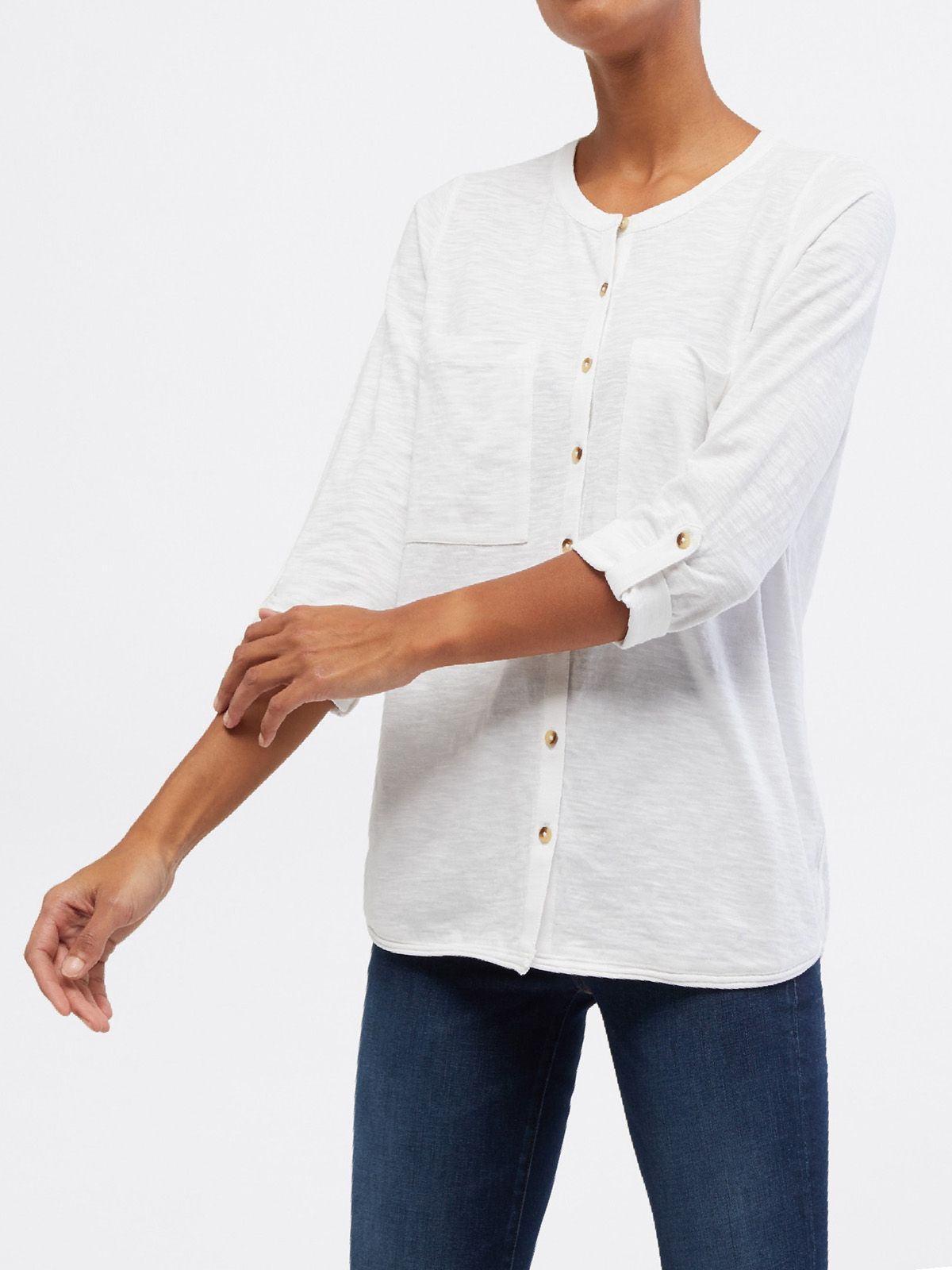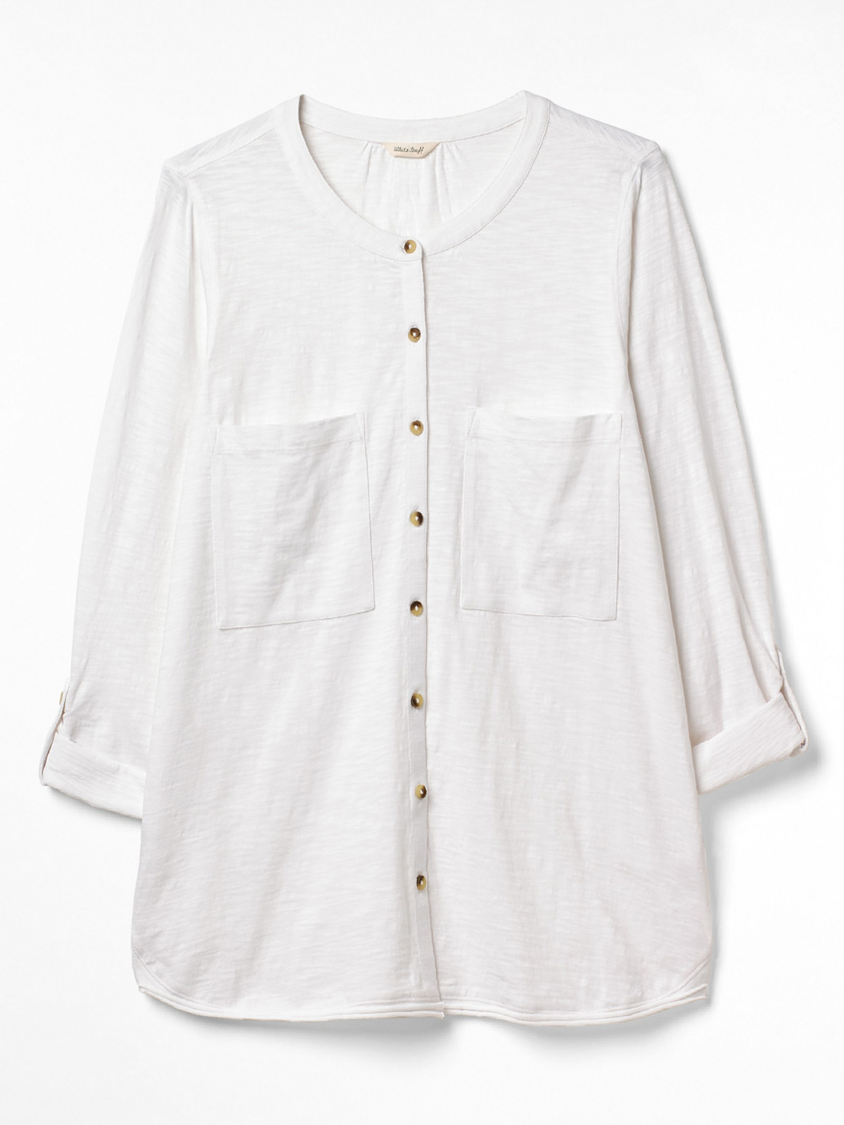 Cue to the fab organic cotton Lou Lou shirt. Here's why you'll love it: 1. Soft and comfy, the cotton used in this jersey shirt is 100% organic. 2. Simple yet practical, this collarless shirt has two pockets and buttoned tabs to keep rolled sleeves secure. 3. It's cut for a relaxed fit and has a flattering curved hem (great for doing half tucks too!). Size 12 high shoulder neck point to hem approx.26in/65cm.