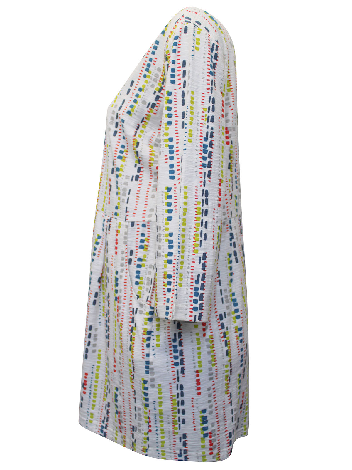 This dress is crafted from a soft cotton fabric, making it a comfortable choice for daytime dressing. Featuring a scoop neck, 3/4 length sleeves and in seam pockets. Length 32in.