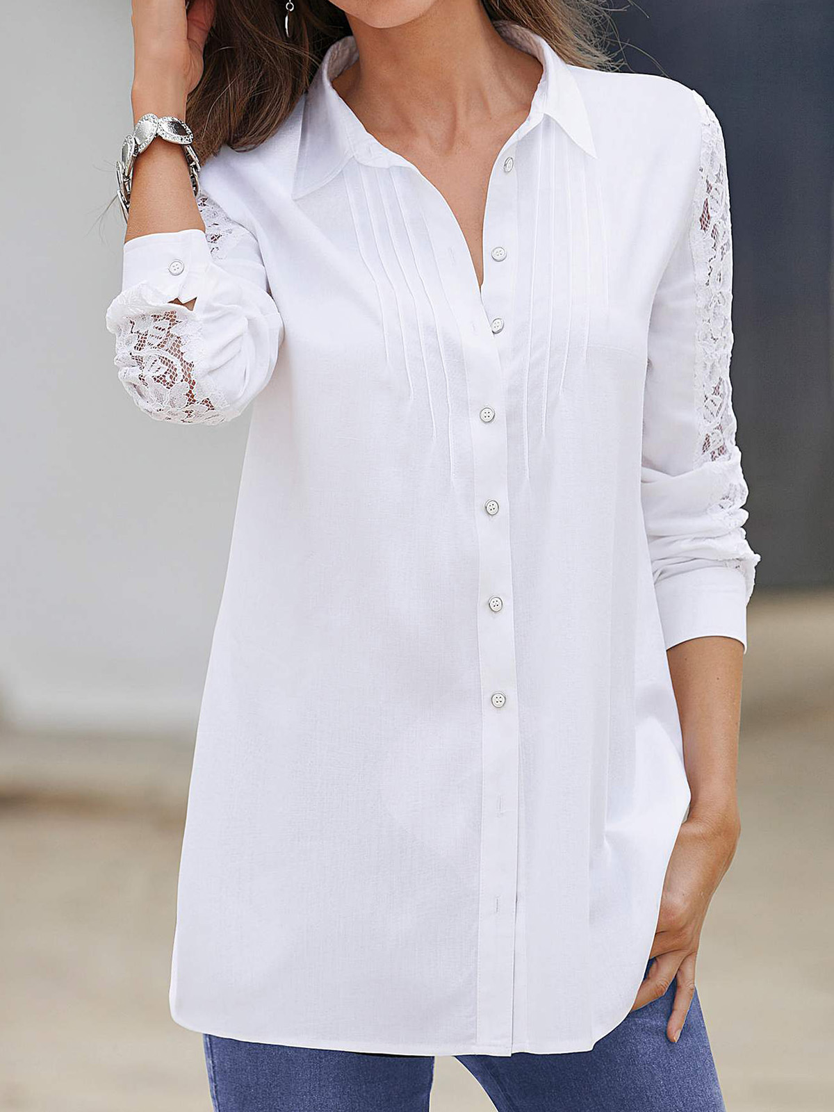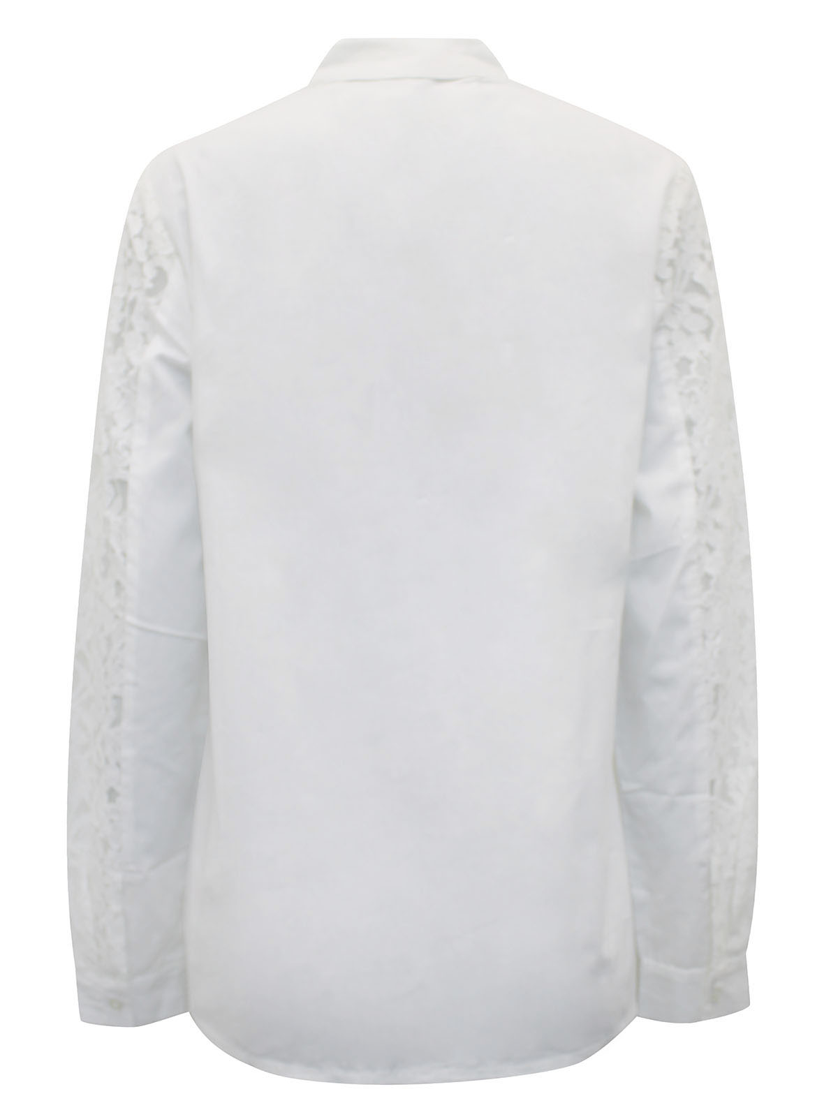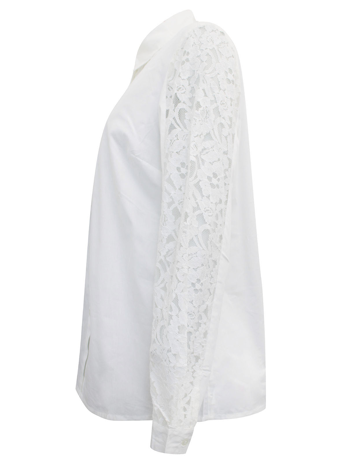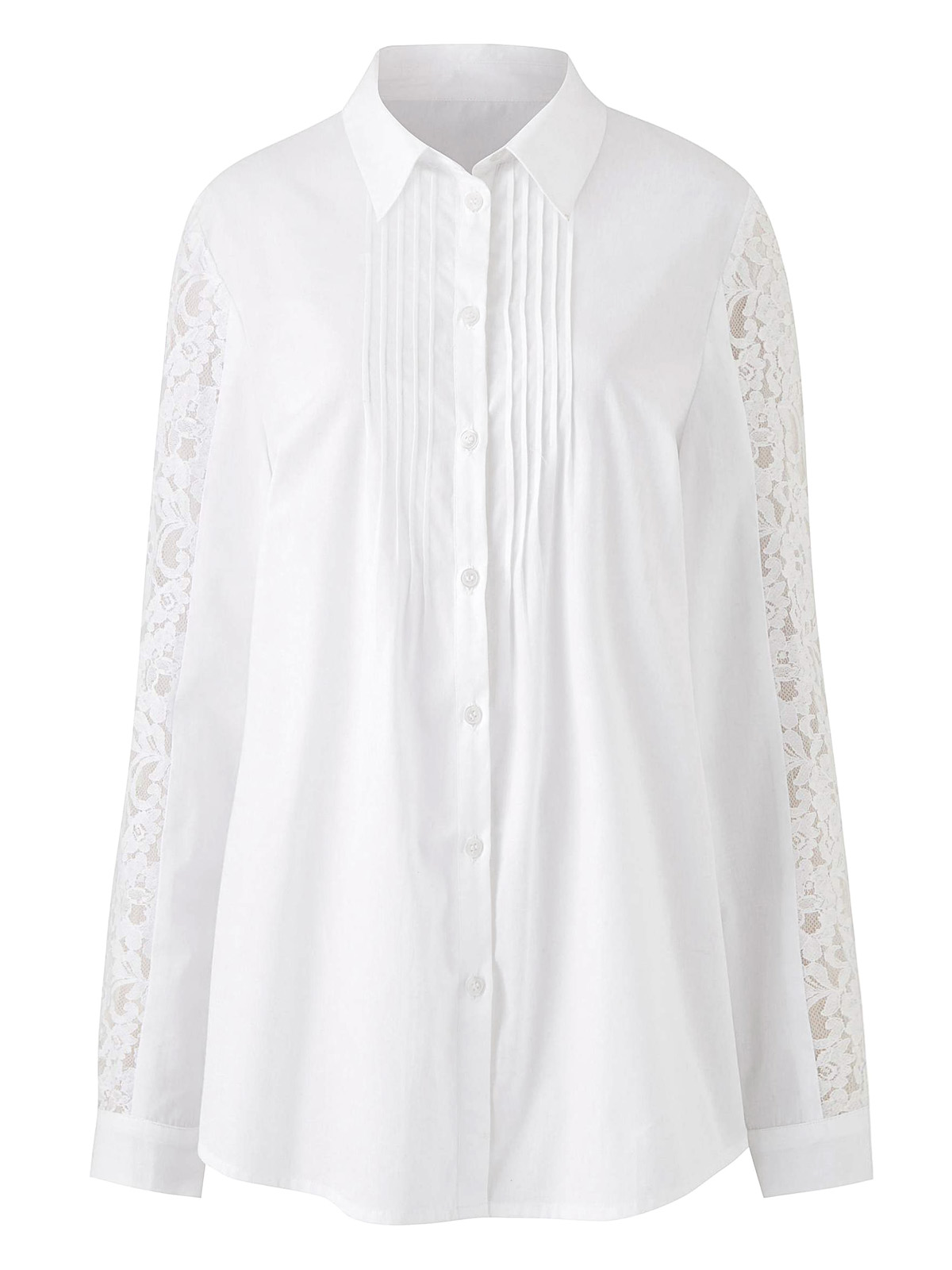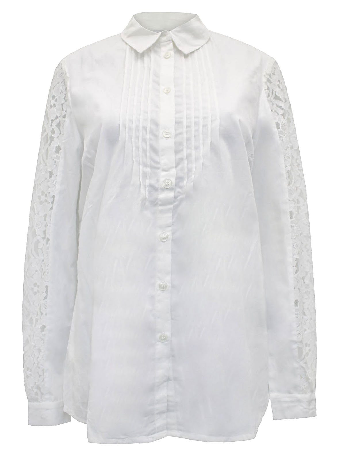This smart white shirt features gorgeous lace sleeves and stylish pintucks to the front. A chic and classic option for any season!