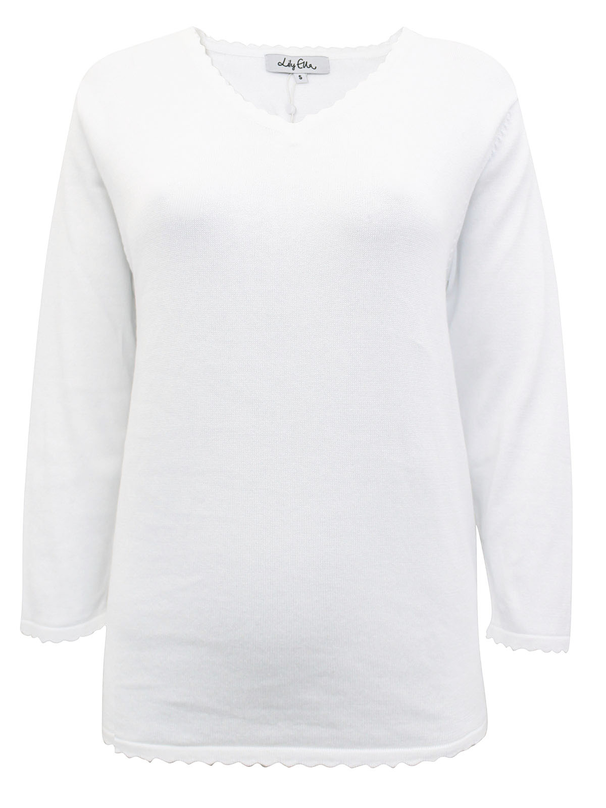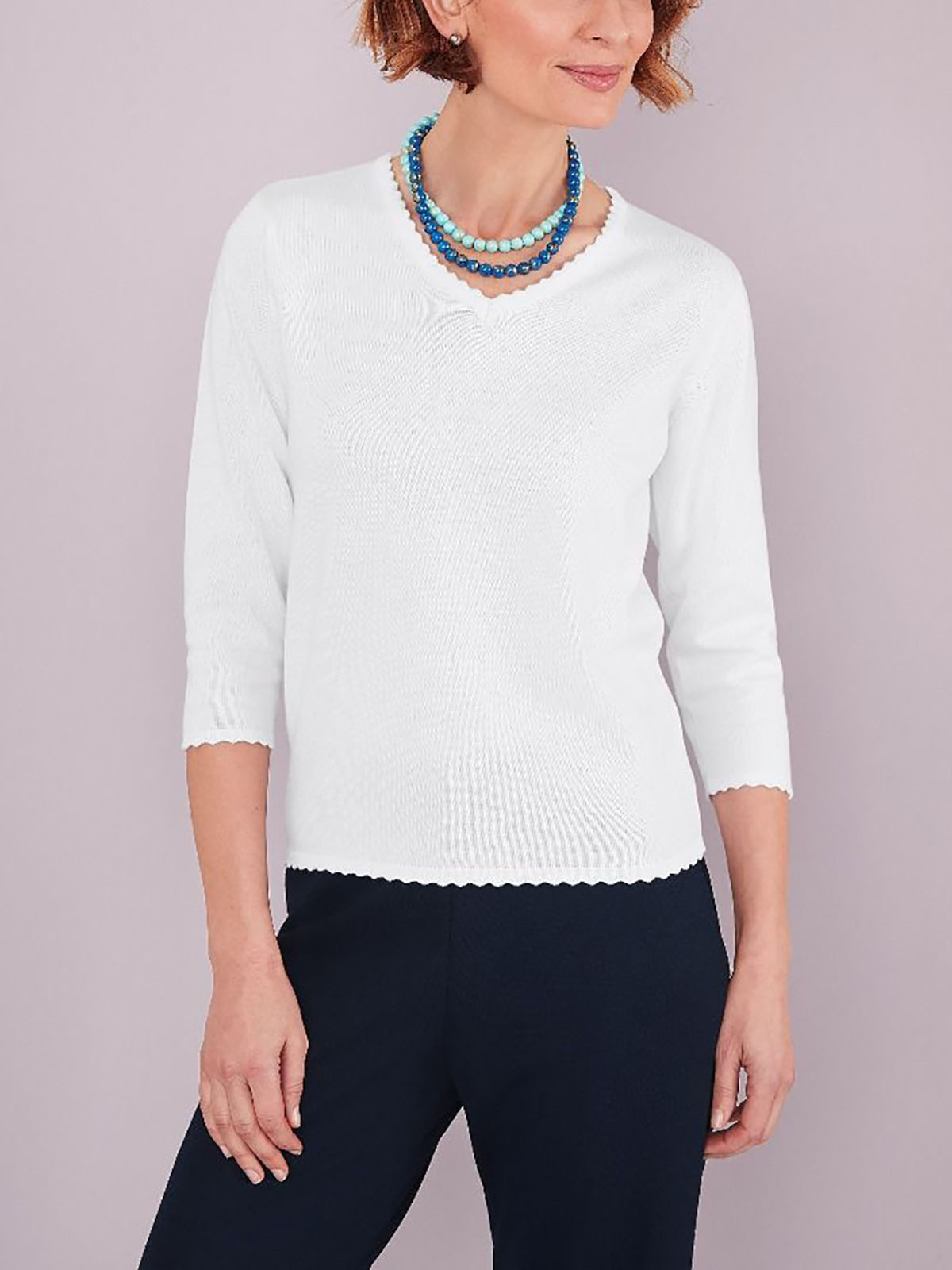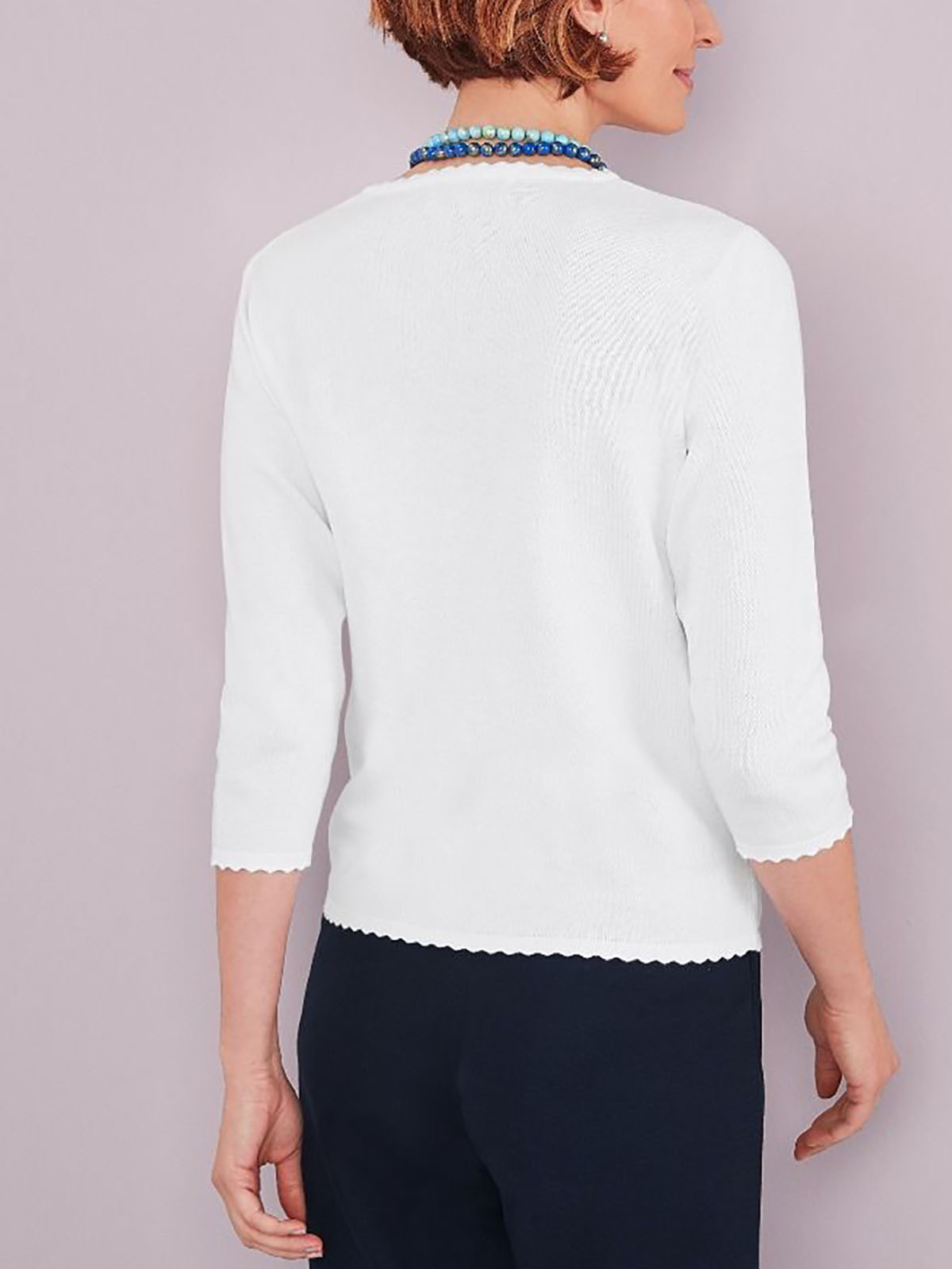 The elegant new, must have knit of the season. Wonderfully smooth and wearable, the scalloped edge adds a touch of polish. Featuring a v-neck, 3/4 fully fashioned sleeves and scallop edged neck, hem & sleeves. Length 24in