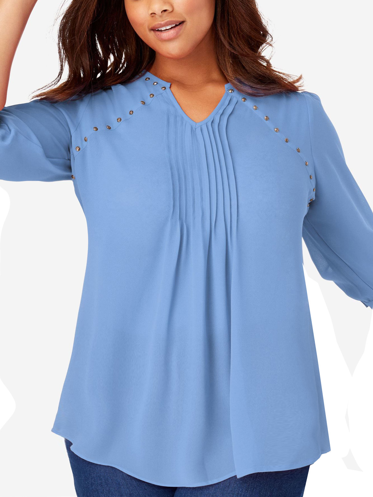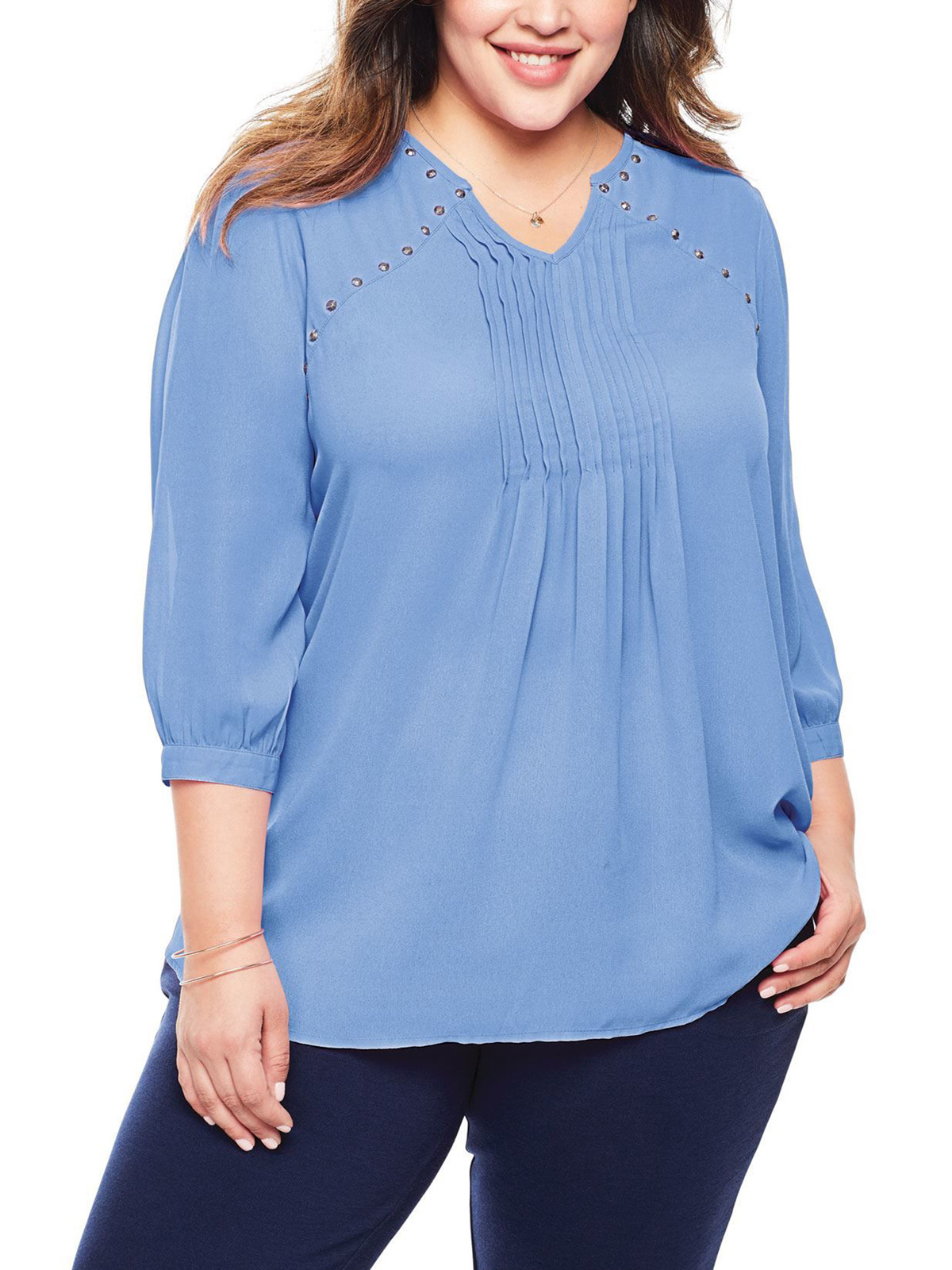Woman Within FRENCH-BLUE Studded Pintuck Blouse - Plus Size 18/20 to 42/44 (Medium to 5X)